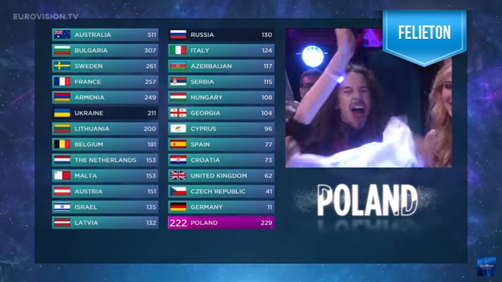 Ten sposób łączenia głosów zapewnia jeszcze więcej emocji. Podczas finału Eurowizji korespondenci podają tylko wyniki głosowania jury w danym kraju. Rankingi publiczności ze wszystkich państw są najpierw sumowane, a punkty zdobyte przez poszczególne piosenki poznajemy na końcu według ustalonej kolejności. Zwycięża występ, który zdobył najwięcej punktów w obu rankingach.